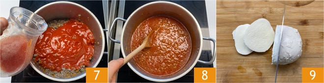 Añadid también un poco de agua (la suficiente para enjuagar la jarra) 7, sal y cocinad a fuego lento durante 45 minutos 8; al final de la cocción debéis obtener un ragú bastante líquido. Mientras tanto, cortad la mozzarella en cubos 9.