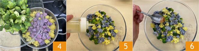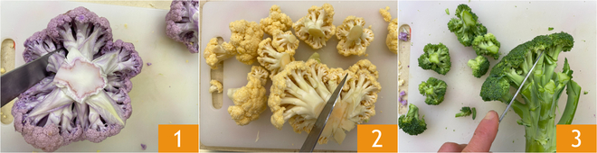 Para preparar las lasa vegetarianas ligeras, empezad limpiando las coles: separad los ramilletes del coliflor morada 1, luego haced lo mismo con el amarillo 2 y con el br F3coli 3.<\/p>