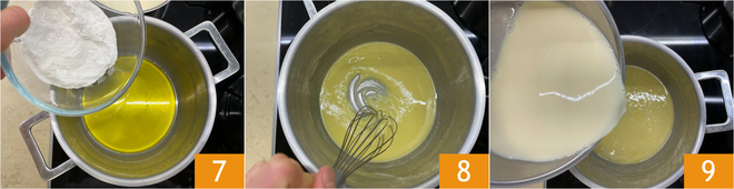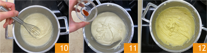 Dejad espesar a fuego, removiendo continuamente con las varillas 10. Cuando haya alcanzado la consistencia adecuada, a F1adid el azafr E1n 11, removed y usad enseguida vuestra bechamel vegana 12.<\/p>