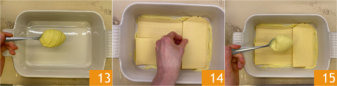 Para montar las lasa, untad en el fondo de la fuente un poco de bechamel 13, luego colocad la primera capa de l E1minas de pasta 14 y cubrid con m E1s bechamel 15.<\/p>