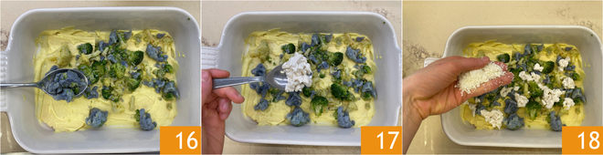 Distribuid una parte de los coliflores 16, luego espolvoread con parte de la mozzarella vegetal desmenuzada 17 y del queso vegetal rallado 18.<\/p>