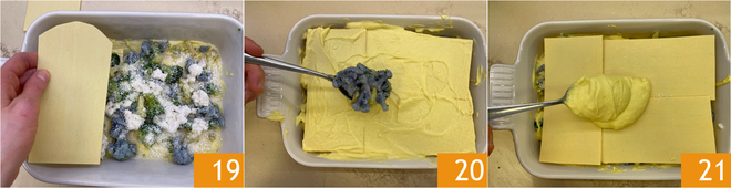 Repetid las capas en el mismo orden: l E1minas de pasta 19, bechamel vegana, mezcla de coles 20 y quesos. Formad una tercera capa con l E1minas de pasta y bechamel 21.<\/p>