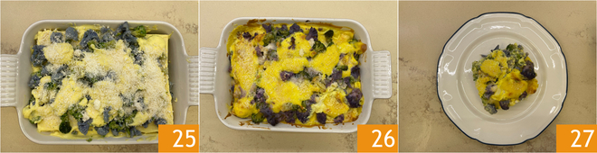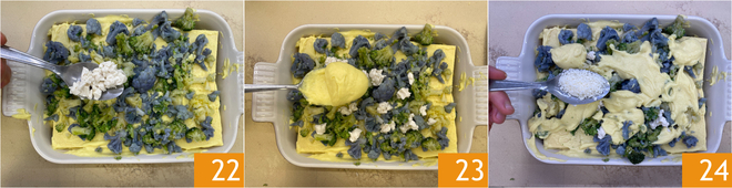 A F1adid los coliflores y los quesos 22, luego rematad con la bechamel restante 23 y abundante queso rallado 24.<\/p>