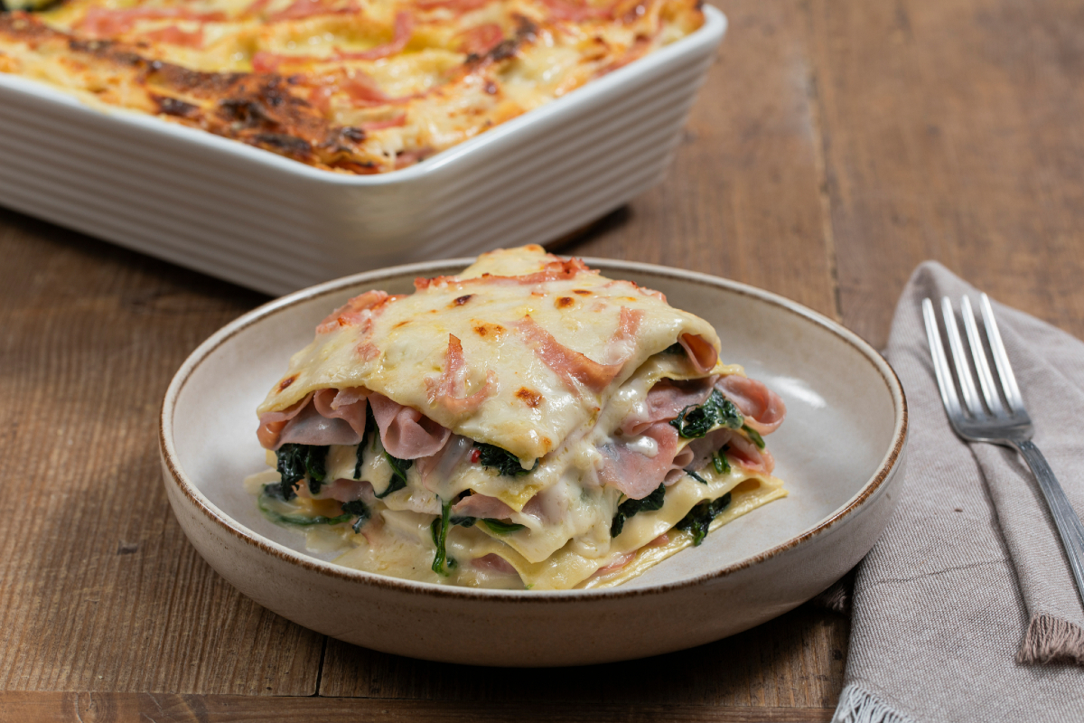 Reinterpretar las Lasaña a la boloñesa nunca es fácil, pero hoy queremos sorprenderos con nuestras lasañas de jamón y espinacas. Una variante blanca que se distingue por su cremosidad y el rico equilibrio de sabores, gracias a la generosa presencia de la bechamel y al toque único que solo el jamón cocido sabe dar. Y para hacer esta lasaña aún más sabrosa hemos añadido espinacas salteadas en la sartén con ajo y guindilla... variando esta verdura por otras de temporada podréis preparar cada vez una receta nueva con la que deleitar a vuestros invitados. La lasaña de jamón y espinacas no solo ofrece una alternativa sabrosa para quien quiera variar del clásico Ragú a la boloñesa, sino que es un primer plato ideal para cenas en familia, ocasiones especiales o simplemente cuando se desea mimarse con algo increíblemente reconfortante y satisfactorio. ¡Descubrid con nosotros cómo prepararla!