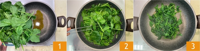 Para preparar las lasañas de jamón y espinacas, empezad por las espinacas. Echadlas en una sartén con un chorrito de aceite 1 y una pizca de sal, mezclad 2 y dejad que se marchiten a fuego medio-bajo durante unos minutos 3.