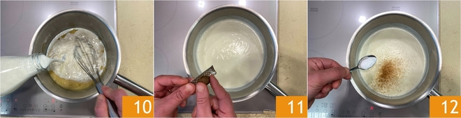 Verted entonces la leche fría en hilo mientras seguís mezclando 10 hasta que espese. Añadid abundante nuez moscada rallada 11 y una pizca de sal 12.