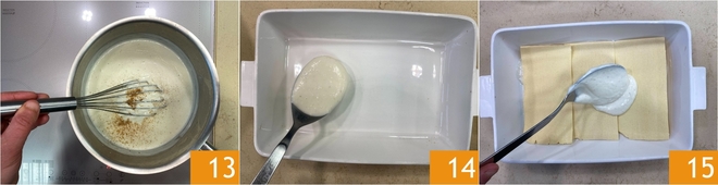 Mezclad bien 13 y retirad la bechamel del fuego. Montad ahora la lasaña, usando una fuente grande de 30x20 cm: poned en el fondo un poco de bechamel 14, luego colocad 3 láminas de pasta al huevo y cubrid con más bechamel 15.