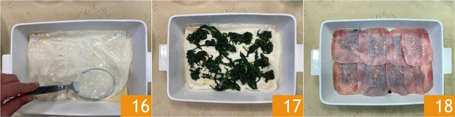 Repartidla bien con el reverso de una cuchara 16, luego añadid las espinacas 17 y colocad encima las lonchas de jamón cocido 18. Añadid un poco de mozzarella y Parmesano rallado 18.
