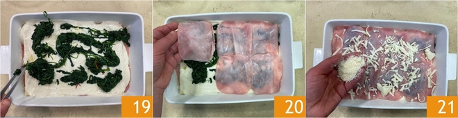 Continuad con una capa más de lasaña, más bechamel, las espinacas 19, el jamón 20, mozzarella y Parmesano rallado 21.
