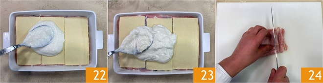 Seguid alternando los ingredientes así hasta obtener 5 capas. La última capa deberá estar compuesta por láminas de pasta y abundante bechamel 23. Extendédla bien con el reverso de la cuchara. Cortad el jamón cocido restante en tiras 24.