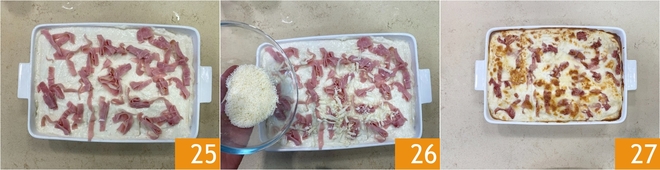 Distribuid las tiras de jamón sobre la bechamel 25, luego añadid aún un poco de mozzarella y Parmesano rallado 26. Hornead en horno precalentado a 220° durante 20-25 minutos, colocando la fuente en la posición más baja durante los primeros 15 minutos y en la más alta durante los últimos 10. Sacad del horno y servid vuestras lasañas de jamón y espinacas 27.