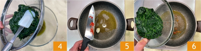 Trasladadlas a un colador para eliminar el exceso de líquido 4. En la misma sartén, sofreíd aceite, ajo y guindilla 5, luego añadid las espinacas 6.