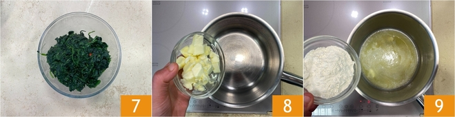 Salteadlas unos minutos para que cojan sabor, luego trasladadlas a un bol 7. Ocupaos de la bechamel: en un cazo verted la mantequilla 8 y dejadla fundir, luego añadid la harina 9 y mezclad rápidamente.