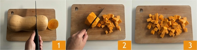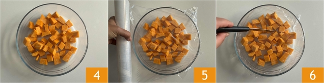 Pon los cubos de calabaza en una fuente grande 4, cubre con film transparente 5, perfora la superficie y cocina en microondas a máxima potencia durante 6 minutos 6. Si no tienes microondas, puedes cocinar la calabaza al vapor: tomará unos 10 a 12 minutos aproximadamente.