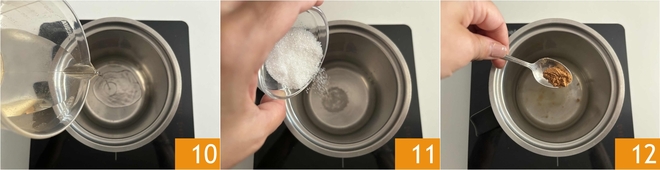 Ahora ocúpate del jarabe: en un cazo vierte el agua 10, el azúcar 11 y las especias 12.