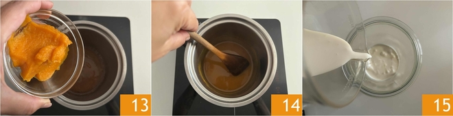 Agrega la crema de calabaza 13 y lleva a ebullición, luego deja hervir a fuego lento durante unos 2 o 3 minutos, continuando a mezclar. Reserva el jarabe y deja enfriar 14. Pasa a la nata montada: vierte la nata fría en un bol 15 y añade el azúcar glas.