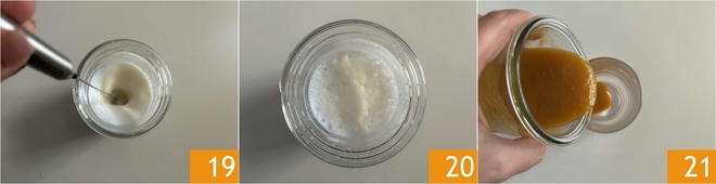 Toma luego un espumador 19 para obtener la espuma 20. Finalmente prepara el café. Estás listo para montar las tazas: vierte el jarabe de calabaza en el fondo 21.