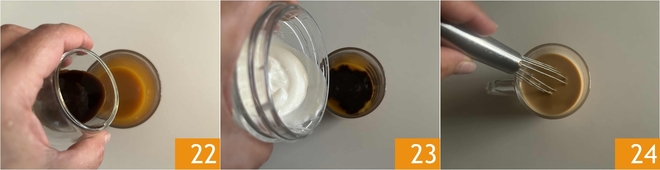 Añade una taza de café 22, luego vierte la leche espumada 23 y mezcla 24.