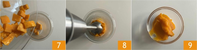 Una vez cocida, transfiere la calabaza al vaso de una batidora de inmersión 7 y bate 8 para obtener un puré liso y homogéneo 9. Reserva.