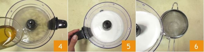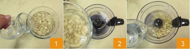 Para preparar la leche de almendra, primero poned las almendras a remojo en un cuenco con 500 g de agua durante al menos una hora 1. Pasado este tiempo, verted tanto las almendras como el agua en una batidora equipada con cuchillas de acero 2, luego añadid los restantes 500 g de agua 3