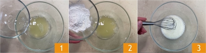 Para realizar los cupcakes de merengue de limón, empieza por preparar el lemon curd: en un bol vierte el zumo de limón filtrado, el agua 1 y la maicena 2, luego mezcla el compuesto con una varilla 3.