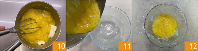 Mézclalo para que se disuelva completamente 10, luego transfiere la crema a un bol 11 y cúbrela con film en contacto 12. Guarda en la nevera para que se enfríe durante 2 horas.
