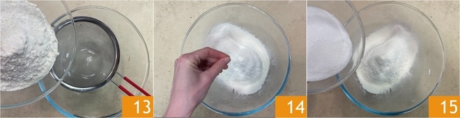 Mientras tanto, dedícate a los cupcakes: tamiza la harina en un bol 13, luego añade la sal 14 y el azúcar 15.