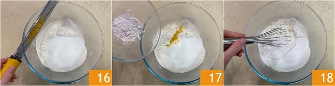 Añade también la ralladura de limón 16 y la levadura 17, luego mezcla los ingredientes secos con la varilla 18.