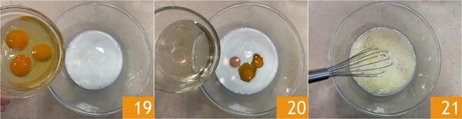 En otro bol vierte la leche, los huevos 19 y el aceite vegetal 20, luego mezcla los líquidos con la varilla 21.