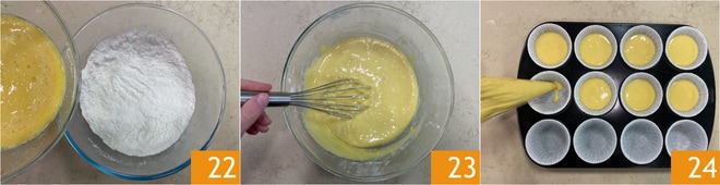 En este punto, añade los líquidos a los ingredientes secos 22 y mezcla bien todo 23. Forra un molde para muffins con cápsulas de papel y llena cada uno con unos 60 g de masa; para ayudarte puedes utilizar una manga pastelera 24. Hornea en horno estático precalentado a 180° durante unos 20-22 minutos.
