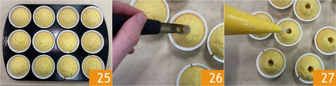 Una vez cocidos, sácalos del horno y deja que se templen 25. Una vez fríos, practica un agujero en los cupcakes con un descorazonador 26. Recupera el lemon curd y colócalo en una manga pastelera, luego rellena los cupcakes llenando la cavidad con la crema 27.