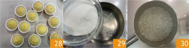 Después de haber rellenado todos los cupcakes 28, dedícate al merengue italiano: en un cazo vierte el agua y 230 g de azúcar 29, luego lleva a ebullición monitorizando la temperatura del almíbar con un termómetro 30.