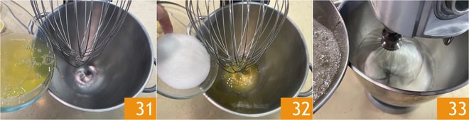Mientras tanto, vierte las claras 31 y los 50 g restantes de azúcar 32 en el bol de una batidora con varillas y comienza a montar. Cuando el almíbar haya alcanzado la temperatura de 121°, viértelo en hilo sobre las claras sin dejar de batirlas 33. Continúa trabajando primero a baja velocidad y luego a velocidad más alta, hasta que la mezcla se haya enfriado completamente.