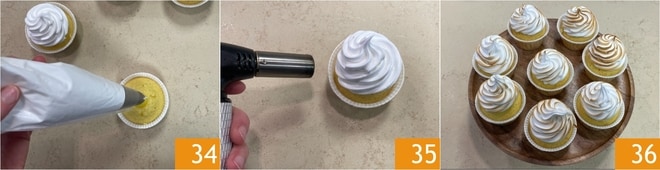 Transfiere el merengue a una manga pastelera con boquilla de estrella y adorna la superficie de los cupcakes con un bonito montículo 34. Finalmente, flamea el merengue con un soplete de cocina 35. Deja enfriar tus cupcakes de merengue de limón en la nevera al menos una hora antes de disfrutarlos 36.