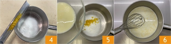 En un cazo pon el azúcar y la ralladura de limón 4, luego añade el compuesto preparado previamente 5. Calienta a fuego lento hasta que el azúcar se haya disuelto 6.