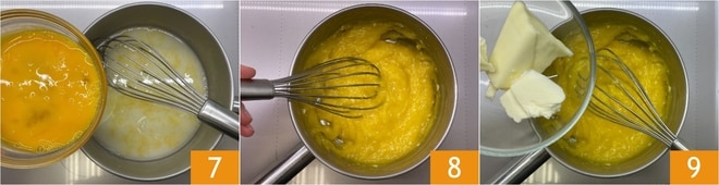 Bate los huevos en otro bol, luego viértelos en el cazo 7 y cocina durante otros 2 minutos, removiendo continuamente 8. Cuando la mezcla se haya espesado, añade también la mantequilla 9.
