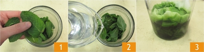 Para realizar el licor de menta, primero lavad y secad cuidadosamente las hojas de menta, luego colócalas en un tarro 1, añade el alcohol 2 asegurándote de que todas las hojas queden empapadas. Coloca encima una hoja de papel absorbente (o de papel de horno) y presiona ligeramente 3. Esto servirá para que las hojas no se oxiden. Luego cierra el tarro y deja macerar durante 24 horas en el congelador. La extracción en frío es óptima tanto para el sabor como para el color final.