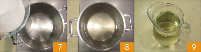Ahora prepara el jarabe vertiendo el agua y el azúcar en un cazo 7 y llevándolo a ebullición 8. Apaga el fuego, vierte el jarabe en una jarra para dejarlo enfriar completamente 9.