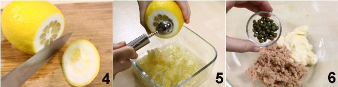 y luego corta la parte opuesta como para formar un sombrero 4. Colócalo en una superficie de trabajo y pon debajo de ti un bol que pueda recoger el jugo y la pulpa del limón. Con un cuchillo pequeño, corta la pulpa por toda la circunferencia interna del limón, luego, con un sacabolas, vacía la pulpa interna teniendo cuidado de no perforar el fondo 5. Procede de esta manera con los 4 limones. En otro bol, coloca la mayonesa, el atún escurrido y desmenuzado, las alcaparras 6,
