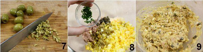 las aceitunas picadas 7, los huevos picados, el cebollino 8 y la pimienta molida; mezcla todo hasta integrar bien los ingredientes. Con la crema obtenida 9, rellena los 4 limones vaciados. Coloca los limones rellenos en un plato de servir; inserta media yema dura en un prensa ajos, aprieta y obtén muchos pequeños fideos que utilizarás para espolvorear la parte superior de los limones. Haz lo mismo con la otra mitad de la yema. Sirve los limones espolvoreando el plato de servir con los fideos de yema dura y cebollino.