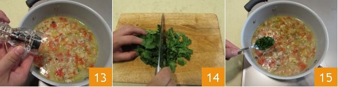 Aromatizad aún con un poco de pimienta y recordad que las navajas deben cocinarse solo unos minutos para que la carne permanezca tierna. 13. Laváis, luego picad el perejil 14 y añadidlo al condimento 15.