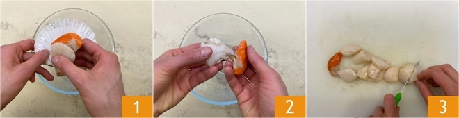 Para preparar las linguine al cartoccio con vieiras, comienza ocupándote de estas últimas. Reserva 4 vieiras enteras para los cartoccios, y limpia las otras: sepáralas delicadamente de su media concha 1 y luego separa el fruto de la valva 2. Finalmente, córtalas en trozos grandes 3.