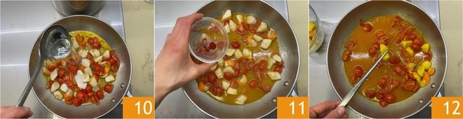 Alarga luego con un poco de agua 10 y vierte el azafrán en polvo 11, continúa la cocción por otros 3 minutos. Retira las vieiras utilizando unas pinzas y resérvalas 12.