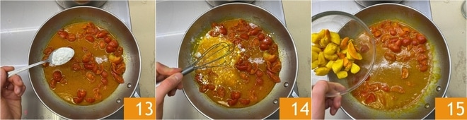 Para espesar el fondo de cocción y hacerlo más cremoso, añade una cucharada de almidón de maíz 13 y haz que se disuelva mezclando con una varilla 14. Añade nuevamente las vieiras y mezcla bien 15.