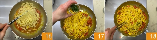 Cuece las linguine en abundante agua hirviendo con sal y escúrrelas al dente directamente en la sartén 16. Perfuma con abundante perejil 17 y cocina brevemente como un risotto 18, añadiendo agua de cocción si es necesario.