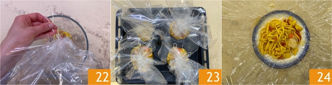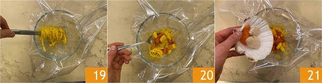 Ahora puedes componer tus cartoccios: nosotros hemos utilizado la "carta fata", un film especial para cocciones al horno. Alternativamente, puedes utilizar papel de horno común. Coloca la hoja dentro de un bol para hacer más práctica la composición, distribuye las linguine 19, añade un poco de salsa 20 y una vieira entera cruda que habías reservado 21.