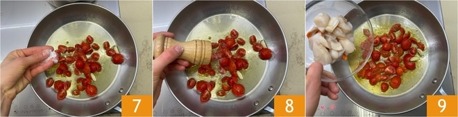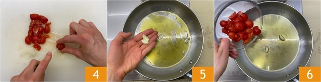 Pasa luego a los tomatitos; lávalos y córtalos en cuartos 4. En una sartén grande, calienta un poco de aceite y añade el ajo machacado 5. Déjalo perfumar y luego añade los tomatitos cortados 6.