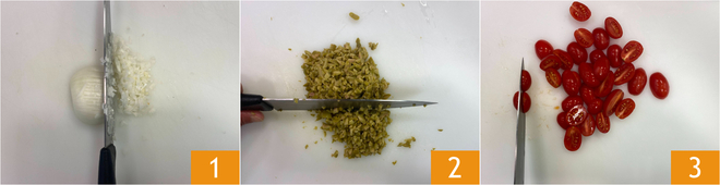 Para preparar las linguine con atún y tomates cherry, primero limpia y pica la cebolla 1 y las aceitunas 2. Lava y parte por la mitad los tomates cherry 3.