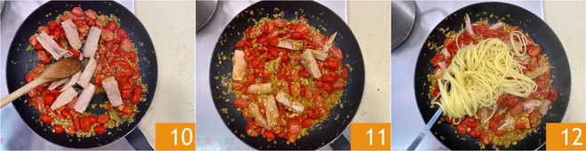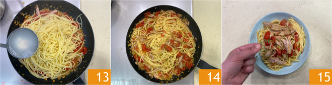 Añade el atún 10 al sofrito y continúa la cocción por el tiempo que tarda en cocinarse la pasta 11. Escurre las linguine en la sartén 12, teniendo cuidado de reservar el agua de cocción.