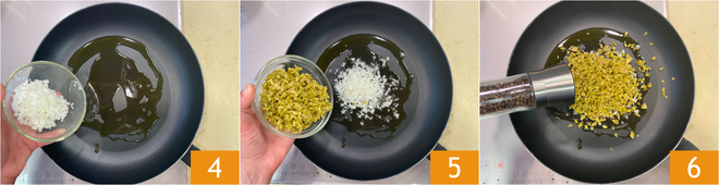 Calienta un chorrito de aceite en la sartén, añade la cebolla 4 y las aceitunas 5, luego añade pimienta 6.